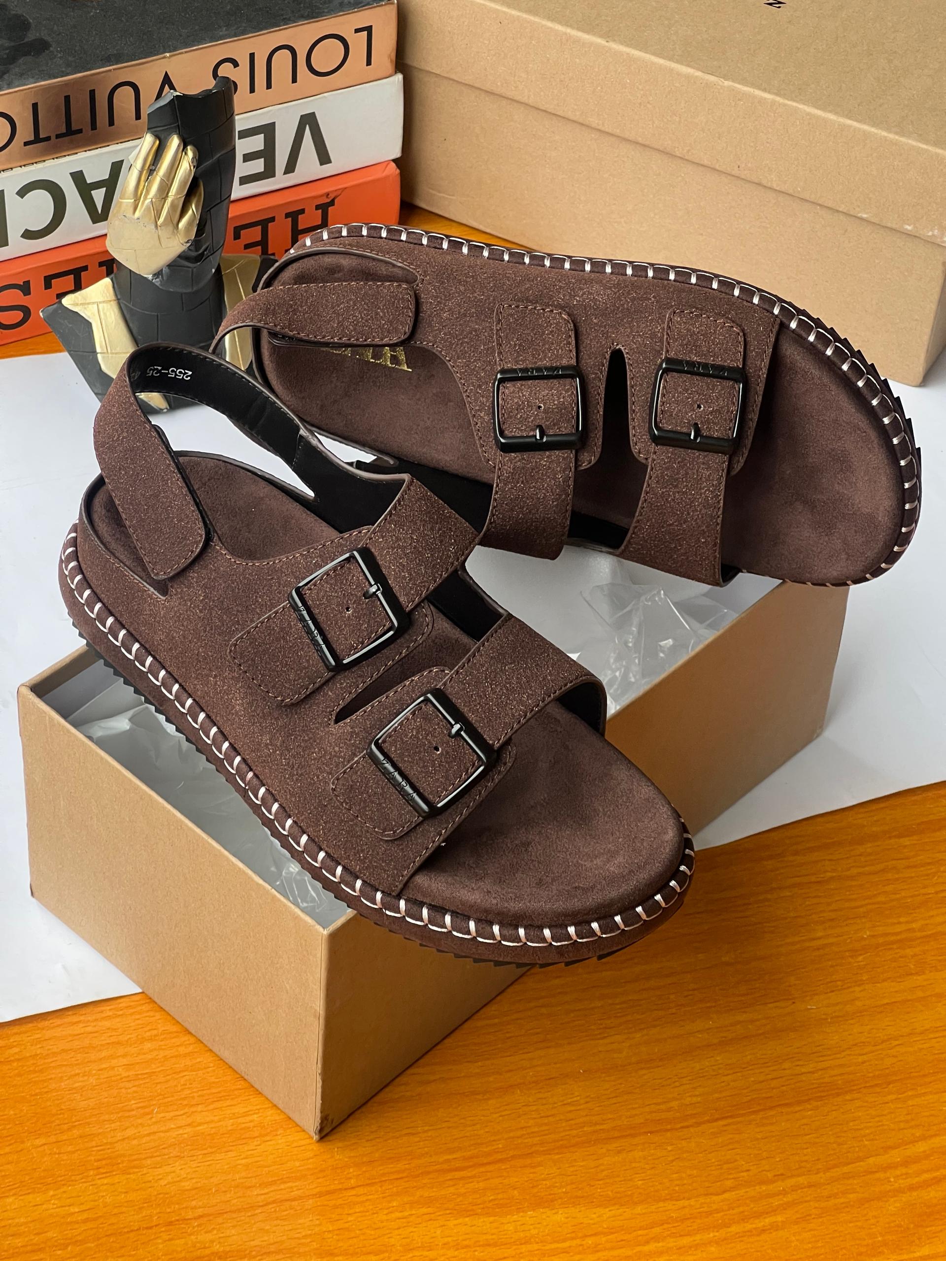 The upper is crafted from premium rich suede that feels luxurious against the skin and develops a beautiful character over time. The distinctive double-strap design features adjustable black metal buckles, ensuring a secure, customized fit that keeps you stable whether you are navigating Lagos streets or relaxing by the pool. The signature white contrast stitching around the sole edge adds a sharp, defined aesthetic that showcases superior attention to detail, setting these sandals apart from ordinary footwear. Beneath your feet, a durable, chunky rubber sole provides superior grip and traction on various surfaces, ensuring you move with confidence and stability.