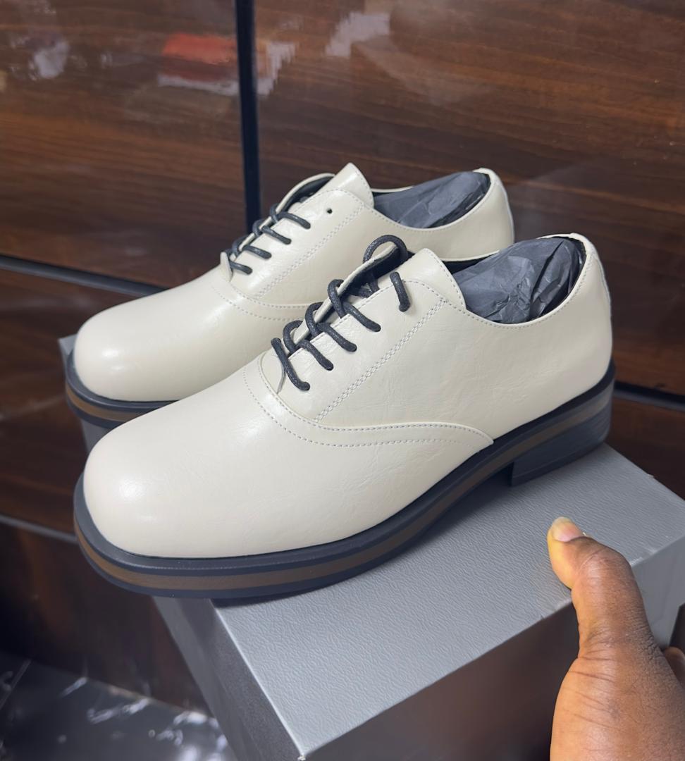 The upper is fashioned from premium smooth leather in a sophisticated cream hue, providing a luxurious feel and a clean, polished finish that stands out from the usual black and brown crowd. The contrast black laces and layered sole create a contemporary look that pairs effortlessly with both Western suits and traditional attire. The durable rubber sole provides all-day comfort and stability, making them ideal for extended wear during long wedding ceremonies, office meetings in Victoria Island, or upscale weekend outings.
