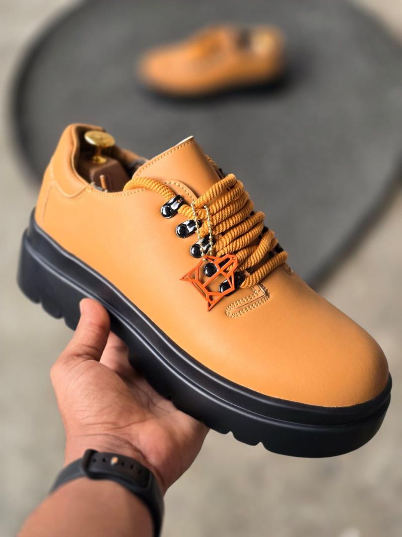 The upper is fashioned from supple, premium-grade leather, providing a smooth, luxurious finish that exudes wealth and refined taste. The distinctive orange geometric charm hanging from the laces adds a striking pop of color and modern flair, distinguishing these sneakers from ordinary footwear and signaling authentic taste to those who know. The massive chunky black sole provides superior height, exceptional stability, and unbeatable traction on Nigerian roads, making them perfect for navigating city streets, weekend outings, or upscale events where you want to stand tall and walk with confidence.
